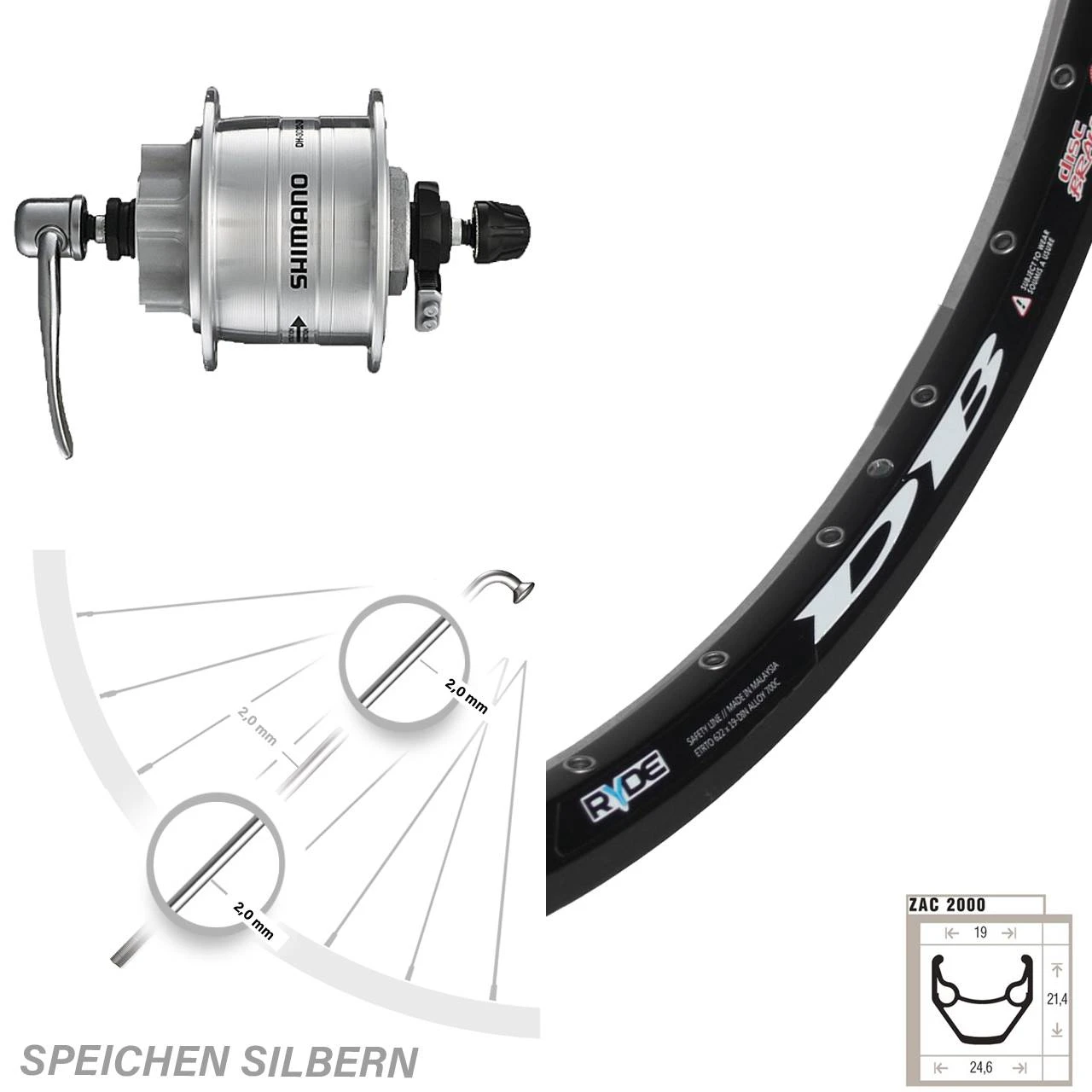Technische Daten vorderes Laufrad Ryde ZAC 2000 Disc schwarz & Nabendynamo Shimano DH-3D32-QR silbern